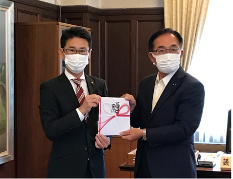 <小椋執行役員総務部長(左)から岩佐名誉会長(滋賀県議会議長)へ目録を贈呈>