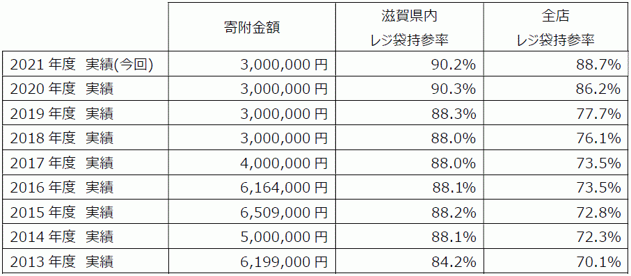 ※寄付金額は、前年度有料レジ袋収益金の実績に基づきます。なお、「滋賀県におけるレジ袋削減の取組に関する協定書」基づき、2017年度以降の滋賀県内店舗における有料レジ袋収益金の一部を、社会福祉法人滋賀県社会福祉協議会が事務局である「子どもの笑顔はぐくみプロジェクト」の寄付金として充当しています。この協定において、有料レジ袋の収益金は環境保全活動及び社会貢献活動に還元することを締結しています。
