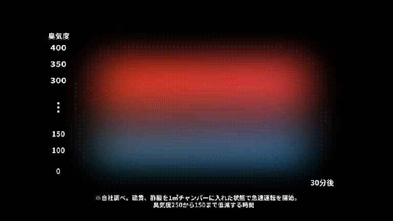 ※測定方法:自社調べ。硫黄、酢酸を1平方メートル チャンパーに入れた状態で急速運転を開始。臭気度250から150まで低減する時間。