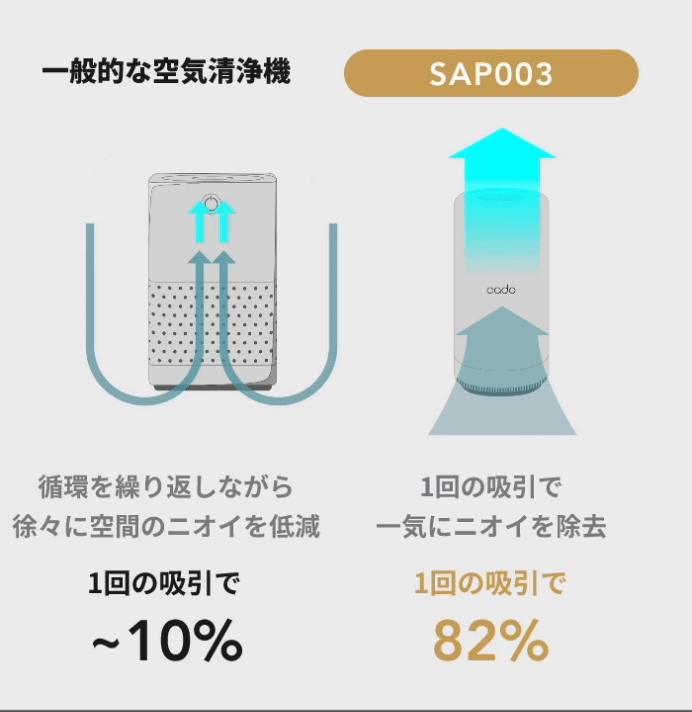 「SAP 003」なら、ニオイの元から吸引・分解・脱臭し、オゾンエアーで空間も脱臭・除菌。しかも、経年しても脱臭力が落ちることはありません。「SAP 003」はこれまで諦めていた気になるニオイを除去し、あなたの大切な空間や家族との時間に快適さをもたらします。