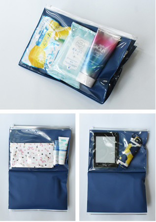 【新製品】廃棄処分となる手帳カバーの原反を再利用したクリアポーチ「大きくまとめるんです」7月29日より販売開始。3つのポケットに防災用品や衛生用品を収納し、万一に備える事ができる。-伊藤手帳