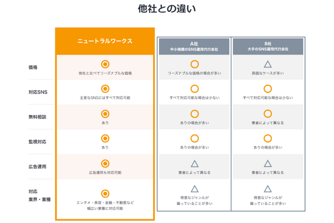 ニュートラルワークスは、SNSの専門領域に特化したエキスパートが数多く在籍しております。豊富な運用経験や分析ノウハウを活かしながら、企画設計、運用から分析までワンストップでご支援し、SNS運用による効果最大化をスピーディーに実現いたします。