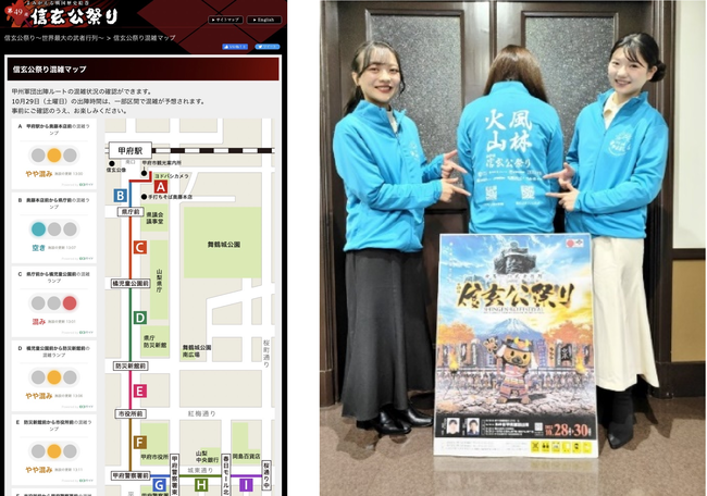 信玄公祭り混雑状況マップシステムを新たに導入し、信玄公祭り公式HPで会場全体の混雑状況の見える化を実施することで、密になりやすい場所に観覧者が滞留せずに密集回避ができました。また、スタッフジャンパーに公式HPへ誘導するQRコードを印字することで、より多くの来場者が簡単に情報を得ることができました。また、パレード出演者やブース出店者等の信玄公祭り関係者への事前抗原検査を行い、陰性者のみが信玄公祭りに参加しました。