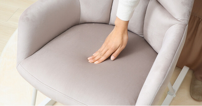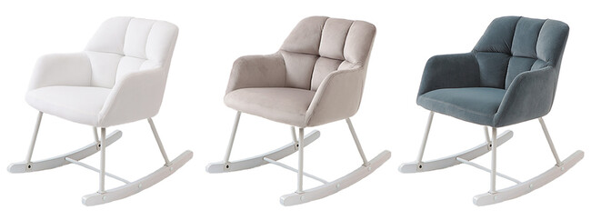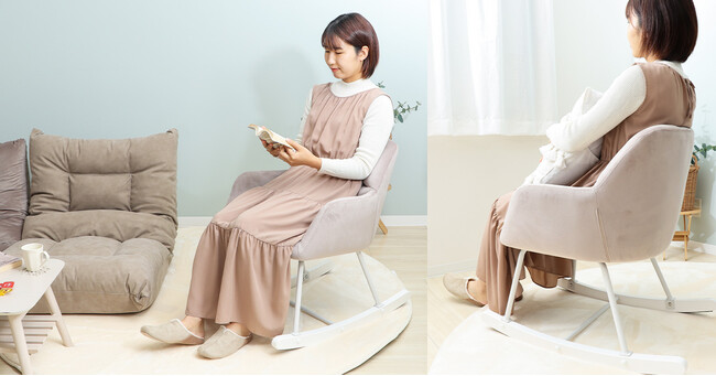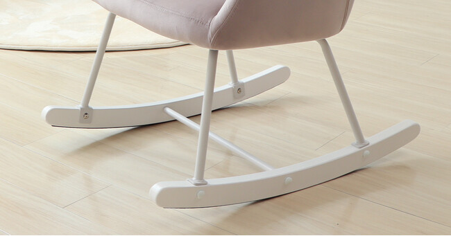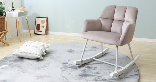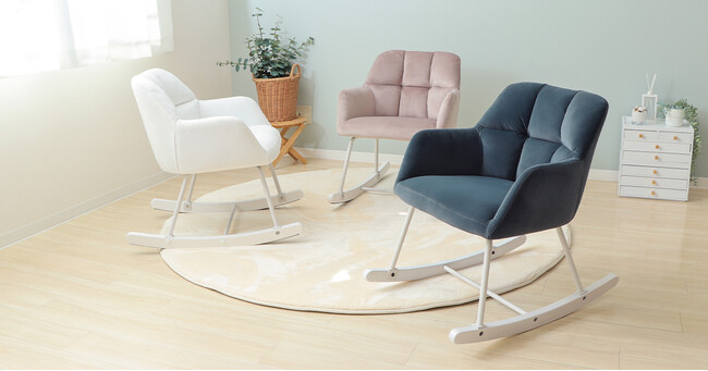 ふかふかなクッションと肌ざわりの良いベロア生地を採用したシートに弧を描いた白い脚が美しいチェア。揺れとふかふかな座り心地がリラクゼーションを誘い、柔らかなペールカラーが心まで軽くしてくれそう。この椅子はまるでセラピー。お部屋の主役にしたい可愛いパーソナルチェアです。