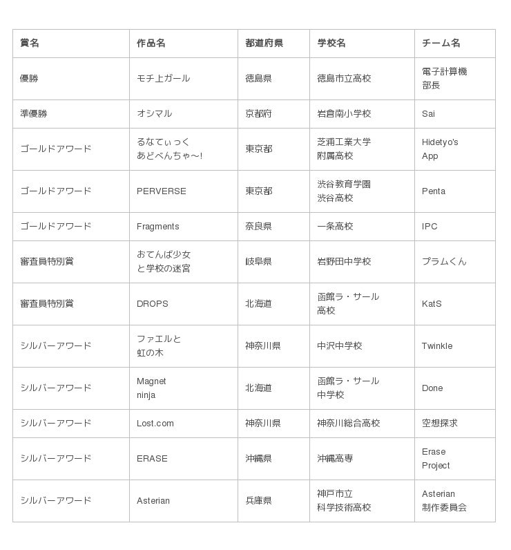 マルチプラットフォーム向け統合開発環境「Unity」を提供するユニティ・テクノロジーズ・ジャパン合同会社は、高校生・高専生(3年生以下)および小・中学生を対象としたゲーム開発コンテスト「Unityインターハイ2018」の最終審査結果を公式WEBサイトにて発表しました。