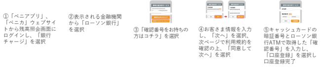 まずローソン銀行ATMでATM認証を行った上で、「ベニアプリ」または「ベニカ」ウェブサイトに口座を登録します。口座登録完了後、「ベニアプリ」または「ベニカ」ウェブサイトの「銀行チャージ」を選択し、チャージ金額とキャッシュカードの暗証番号を入力するだけでチャージが可能です。具体的なATM認証および口座登録方法は以下の通りです。
