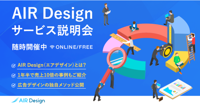 本説明会では、Webマーケティングにおいて多くの方が持つ悩みである「広告の成果が出ない」「LPのPDCAを回したいがリソースが足りない」「Webマーケターの採用が難しい」「Webマーケティングを理解しているデザイナーに広告クリエイティブを制作してほしい」等をAIR Designがどのように解決しているのかについてや、AIR Designのプロチームのサポートにより1年半で売上が10倍になった企業様の事例のご紹介に加え、AIR Designのサービスを体感いただけるワークショップも実施します。