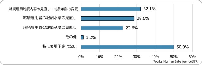 定年以降の継続雇用者についての課題としては「対象者のモチベーション」、「対象者の報酬水準」が特に目立つ結果となりました。また、定年延長についての課題と比較すると、「人件費の高止まり」の割合が小さいことが明らかになりました。定年以降の継続雇用者について、法人の今後の取り組み予定としては、「継続雇用制度内容の見直し、対象年齢の変更」が32.1%、「継続雇用者の報酬水準の見直し」が28.6%、「継続雇用者の評価制度の見直し」が22.6%という結果となりました。一方で、多岐にわたる課題の所在に対して、「特に変更予定はない」と回答した法人が50%にのぼっており、定年以降の継続雇用者に対する取り組みを積極的には行っていない傾向がうかがえます。