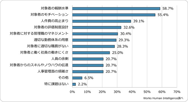 定年延長についての課題として、特に「対象者の報酬水準」、「対象者のモチベーション」、「人件費の高止まり」の3つが挙がりました。