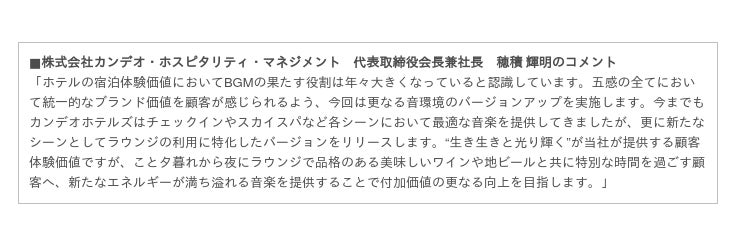 今夏開業する「カンデオホテルズ熊本新市街」(7月10日開業予定)と「カンデオホテルズ宇都宮」(8月26日開業予定)では、これまでの館内でのBGM演出に加え、ラウンジにて提供する酒類の消費が進むBGMを検証し、“もう一杯飲みたくなる”音作りに挑戦します。ラウンジを訪れるあらゆる客層に対して、時間帯別にどのようなテンポや曲調のBGMが好まれ、どのようなドリンクのオーダーが進むのか、実証実験を行なうことでお客様の滞在時間に更なる付加価値を産み出すこと狙います。今後、カンデオホテルズの既存施設においても検証結果を活かしたより効果的な「音」の演出とアプローチ方法を検討していきます。
