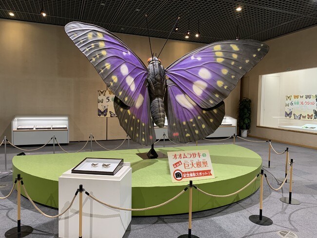 本展示では、ゴルフ場の建設の影響によって減少しているオオムラサキや、温暖化によって増加しているナガサキアゲハの展示も行い、自然環境の変化によるチョウの移り変わりについて学べる展示となっています。