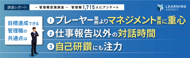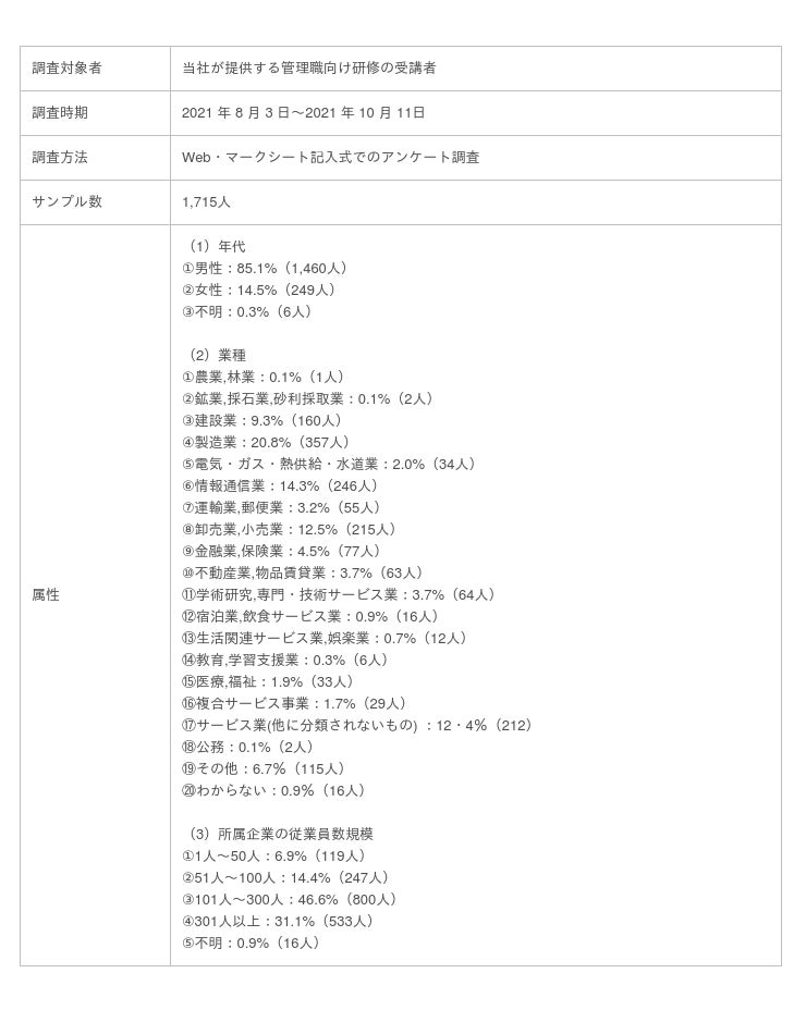 累計13,000社320万人以上に人材育成サービスを提供する株式会社ラーニングエージェンシー(旧トーマツ イノベーション株式会社、本社 東京都千代田区、代表取締役社長 眞崎大輔)は、2021年8月3日〜2021年10月11日の期間で、1,715 人の管理職を対象に「管理職意識調査」を実施し、その結果を公表しました。