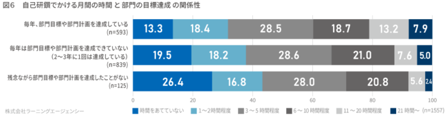 部門目標や部門計画を達成したことがない管理職では「時間をあてていない」が26.4%だったのに対し、毎年目標達成している管理職で「時間をあてていない」を選んだのは13.3%。目標を達成したことがない管理職より13.1pt少ない結果でした。月間11時間以上を費やしていると答えたのは、目標を達成したことがない管理職で8.0%、2〜3年に1回は達成している管理職で12.6%、毎年目標を達成している管理職で21.1%です。さらに目標達成度が高い管理職ほど自己研鑽の時間をより多く確保していることが推察されます(図6)。