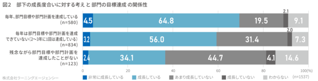 一方、「残念ながら部門目標や部門計画を達成したことがない」を選んだ管理職では、「非常に成長している(2.4%)」「成長している(34.1%)」を合わせて4割弱。「毎年は部門目標や部門計画を達成できていない」と答えた管理職では、両者の間となる「非常に成長している(3.2%)」「成長している(56.0%)」の計6割の方が部下の成長を実感しています(図2)。
