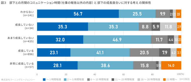 ただ、その中で部下の成長について「わからない」を選択した管理職は56.7%が「〜1時間」と回答。「成長していない」から「非常に成長している」まででは最大でも35.3%であったのに対して、突出する結果となっています。反対に、部下が「非常に成長している」を選んだ管理職では「21時間〜」という回答が14.0%を占めました。「わからない」から「成長している」までを選んだ管理職においては4%未満であることと比較すれば、大きな割合です(図3)。