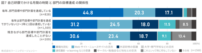 さらに、具体的にどのような自己研鑽をしているのかを複数回答で尋ねたところ、毎年目標達成している管理職は、そうでない管理職よりも「書籍を読む」割合が高く、4割超を占めました。逆に自己研鑽について「何もしていない」を選んだのは「達成したことがない」と答えた管理職が最も多くなっています(図7)。