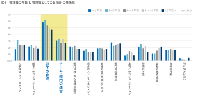 管理職の目標達成には、部下の成長だけでなく管理職自身のスキルアップも欠かせません。実際、管理職の悩みを3つまでの複数回答で尋ねた質問では、管理職の経験年数にかかわらず「部下の成長」が約5〜6割を占めており、管理職に共通する悩みとなっています。同時に、「チーム・部門の運営」も約3割の方に選ばれ、第2位でした(図4)。