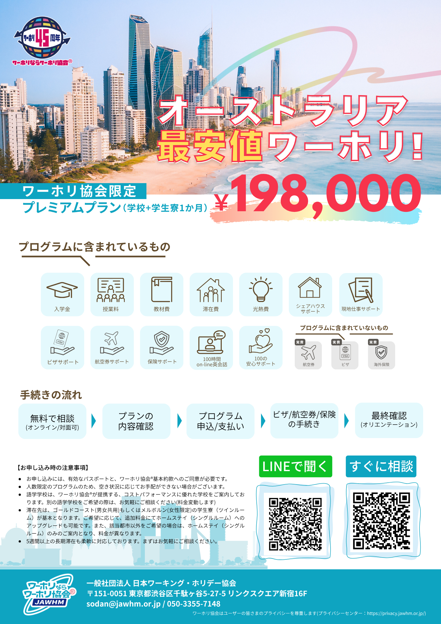 ワーキングホリデー制度を支援し、促進している非営利団体、一般社団法人日本ワーキング・ホリデー協会(JAWHM)は、2025年10月に提供開始した198,000円オーストラリア留学パッケージへの申し込み数が予想を大きく上回ったことを受け、利用者の声と需要に応える形で、協会独自運営の学生寮 「ワーホリハウス」 をゴールドコースト・メルボルン・ブリスベンの3都市へ拡大いたしました。