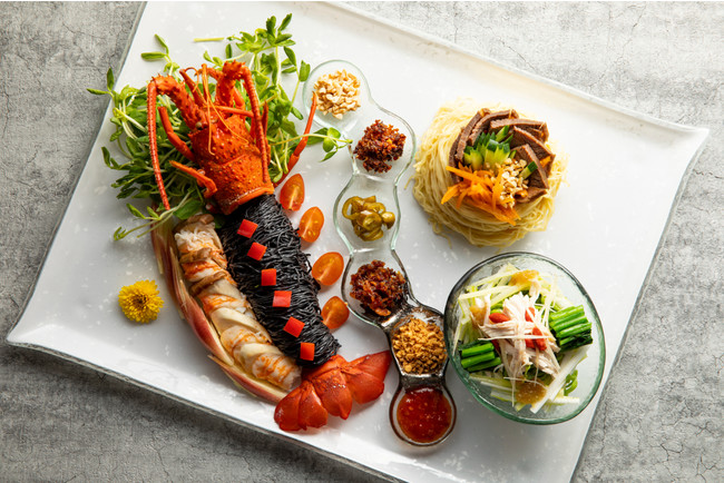 モダンで洗練された味わいと斬新なプレゼンテーションで魅了するシェフ、 アルバート・ツェがお届けするのは、暑い夏の季節に涼を感じる夏季限定チャイナブルー涼麺3種。竹炭を加えた黒い麺とイセエビの赤い色彩のコントラストが印象的な「四川風 山椒を効かせたイセエビと竹炭麺の冷麺」、ほうれん草の緑の麺がまるで宝石の翡翠のように輝く「香港風 鶏肉と葱、生姜の翡翠冷麺」、そしてスタミナ満点の「台湾風 牛肉冷麺」をご用意しました。また、この3種類の麺を6種類の薬味とともに味わう豪華な盛り合わせの一皿は2名様でお楽しみいただけます。