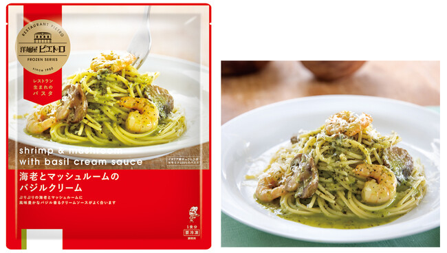 ピエトロレストランで人気の「バジルクリーム」をアレンジ。ぷりぷりの海老とマッシュルームに、バジル香るクリームソースが風味豊かなパスタです。