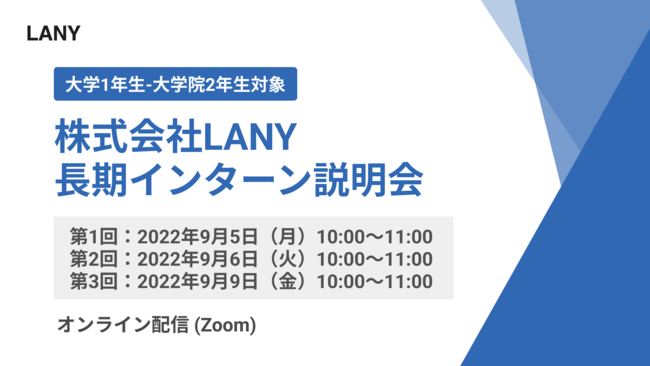 SEOコンサルティングを提供する株式会社LANY(東京都渋谷区、代表取締役社長:竹内渓太)は、Webマーケティング職で働くことを希望する大学生・大学院生に向けた「長期インターン説明会」を2022年9月5日(月)、9月6日(火)、9月9日(金)に開催いたします。