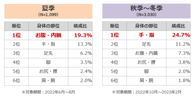 夏季と秋季〜冬季の冷え性不満を抽出し、テキスト中に身体の部位のワードが含まれる割合を確認しました。夏季は「お腹・内臓」が1位に挙がるのに対し、秋季〜冬季は「手・指」が1位に挙がっており、季節によって冷えを感じやすい部位に違いがあることが分かります。