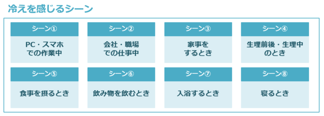 冷えを感じる8つのシーンに着目し、特徴的な不満をピックアップしました。レポート内では各シーンごとに3〜4件の不満を紹介しています。