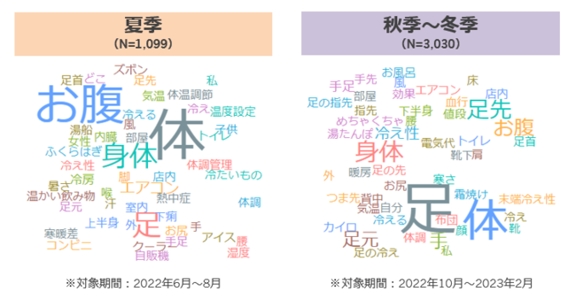 夏季と秋季〜冬季の冷え性不満を抽出し、出現キーワードの傾向を確認しました。夏季に出現するワードとしては「エアコン」「クーラー」「寒暖差」「お腹」「内臓」「冷たいもの」などが挙がります。秋季〜冬季に出現するワードとしては「下半身」「足元」「末端冷え性」「血行」「湯たんぽ」「布団」などが挙がります。