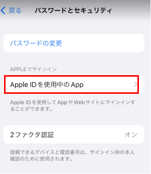 また、iPhoneでは「設定」からユーザー名とアイコンの表示個所へ進み、「Apple IDを使用中のApp」を開くと、現在この設定がされているアプリケーション等を確認できます。