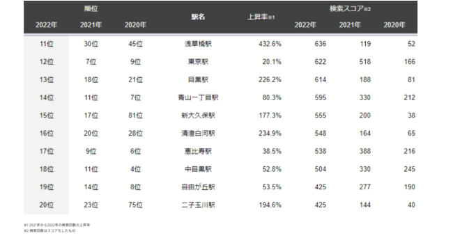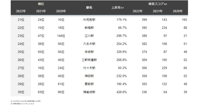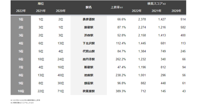 表参道駅、原宿駅、渋谷駅は、2020年の調査開始時から3年連続でトップ3位になります。また、検索スコアの量も4位以降の駅と差の開きも大きく、非常に高い人気を誇っています。