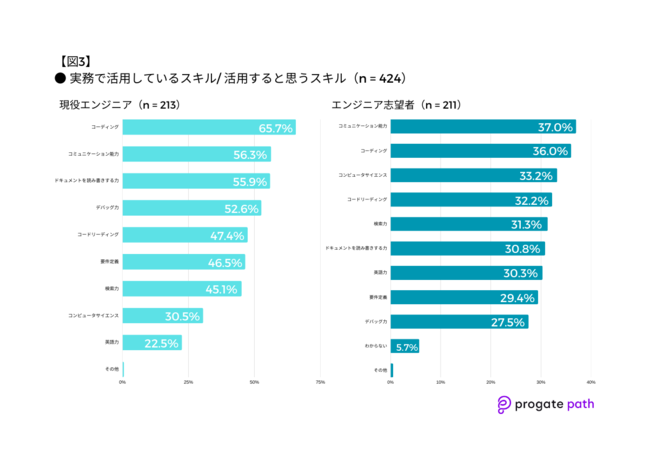 ITエンジニア歴3年以上で仕事でプログラミングを活用している現役ITエンジニア213人とプログラミングを学習しているITエンジニア志望者211人に対してITエンジニアの実務に対する調査を行った。日々の実務において、現役ITエンジニアに「ITエンジニアとして活用しているスキル」、ITエンジニア志望者に「ITエンジニアが活用すると思うスキル」を複数回答で聞いたところ、上位3つはITエンジニアが「コーディング」、「コミュニケーション能力」、「ドキュメントを読み書きする力」となり、ITエンジニア志望者が「コミュニケーション能力」、「コーディング」、「コンピュータサイエンス」となった。