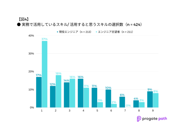 また、複数回答におけるスキル選択数の中央値は、現役ITエンジニアが4つに対してITエンジニア志望者は2つとなった。