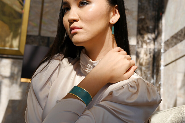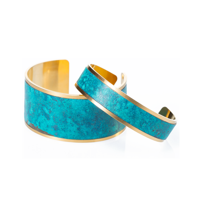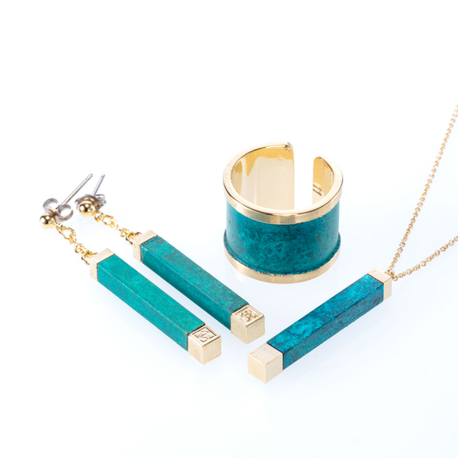 高岡銅器の着色技術を採用した神秘的なターコイズブルーは、富山県の伝統工芸士 折井宏司氏によって生み出されました。かつては大仏や寺院の鐘、仏具の塗装に使われていた日本独自の技術です。銅の色付けには、大根、糠、米酢、梅干、日本酒など天然の素材も使われており、化学反応により腐食や錆を起こすことで色を表現しています。