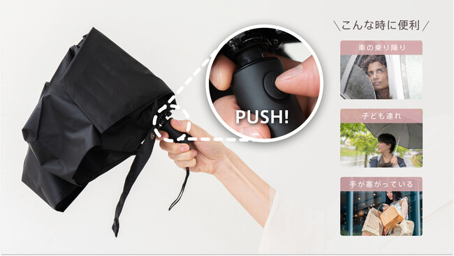 50cmサイズは210g、55cmサイズは235gと、自動開閉でありながら超軽量を実現しました。さらに、スリムな形状でバッグにもポケットにもすっぽり収まります。 いざという時のお守り傘として、常備しておくのもおすすめです。