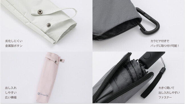 女性のカバーは劣化しにくい金属製のボタンを採用し、傘の出し入れがしやすいよう横幅も広めに。男性のカバーは機能性を重視し、カラビナとファスナーをつけました。どちらのカバーも落ち着いたオリジナルのロゴ入り。使い勝手とデザイン性を併せ持つカバーに仕上がっています。