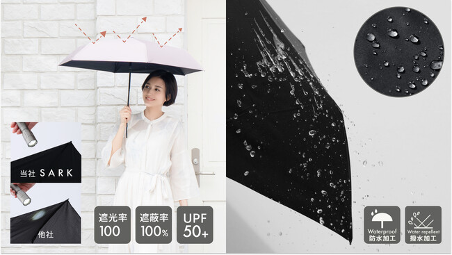 遮光率・遮蔽率100%、さらにUPF50+の最高等級のUVカット率で紫外線対策はバッチリ。傘の内側にはブラックコーティングを施しているため、地面からの照り返しを防ぎ、炎天下でも涼しく快適にお過ごしいただけます。高密度・高防水生地を採用しているので、撥水性も抜群。しっかり水を弾くので、雨の日も安心です。