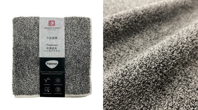 「Triporous(トリポーラス)」は、ソニーグループ株式会社が開発した籾殻(もみがら)から生まれた天然由来の多孔質カーボン素材で、“消臭・抗菌効果”のある素材です。余剰バイオマスである籾殻を利用したサステナブルな素材として注目を浴びています。この素材を使用することで、環境に配慮したタオルハンカチが誕生しました。