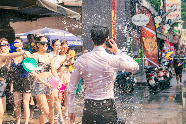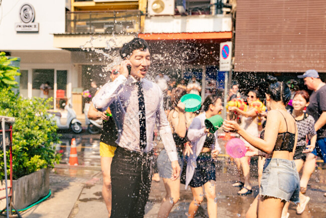 「ソンクラン期間中のタイで水かけ祭りに巻き込まれるビジネスマンマッチョ」