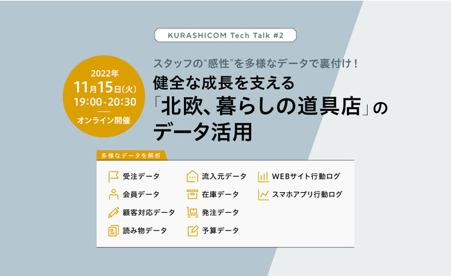 ライフカルチャープラットフォーム「北欧、暮らしの道具店」を運営する株式会社クラシコム(本社:東京都国立市、代表取締役:青木耕平)は、2022年11月15日(火)にデータ活用について担当者が解説するオンライントークイベント[Kurashicom Tech Talk #2 健全な成長を支える「北欧、暮らしの道具店」のデータ活用]を開催します。