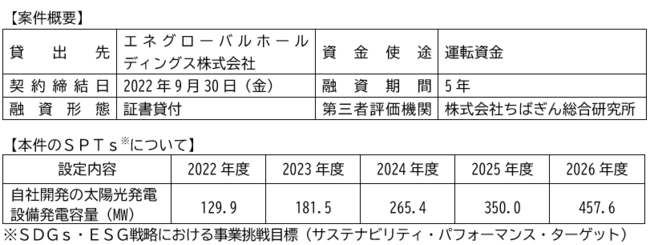 千葉銀行(頭取 米本 努)は、2022年9月30日(金)、エネグローバルホールディングス株式会社(代表取締役 李 力欧、本社:東京都千代田区)に対して、「ちばぎんSDGsリーダーズローン(サステナビリティ・リンク・ローン型)」を取り組みましたのでお知らせします。