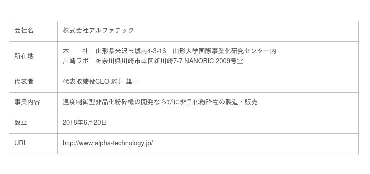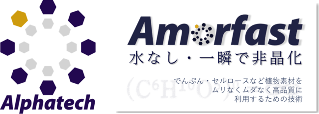 株式会社アルファテック(本社:山形県米沢市 代表取締役:駒井雄一 以下、アルファテック)は、山形大学西岡研究室で開発された、水を使わず一瞬ででんぷんやセルロースを非晶化する独自技術を有しており、この技術を「Amorfast(アモルファスト)」と名付けました。非晶化(amorphous)+速い(fast)が語源です。