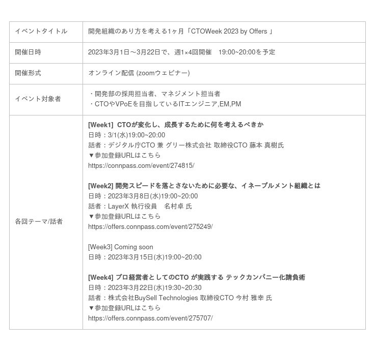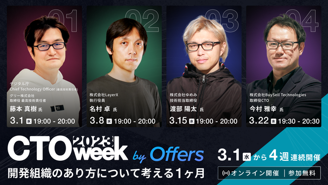 リリースを記念し、開発組織のマネージメント担当者に向けたイベント「CTOWeek 2023 by Offers」を開催するに至りました。あらゆる業界をリードしている開発マネジメント経験者をお招きし、日々感じている課題や悩み、トレンドなどについてヒントとなる場を提供します。