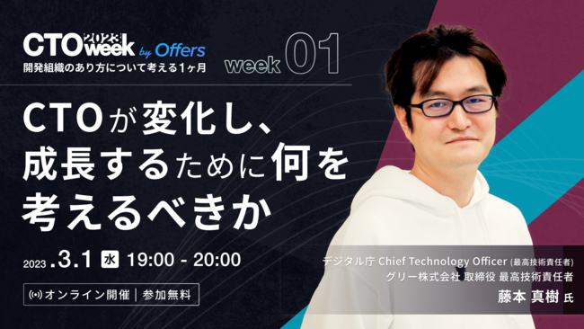 ITエンジニア/デザイナーの副業・転職サービス「Offers(オファーズ)」を運営する株式会社overflow(本社:東京都港区、代表取締役: 鈴木裕斗・田中慎 以下、overflow)は、開発組織のマネージメント担当者に向けたイベント「CTOWeek 2023 by Offers」が3月1日(水)19時より開催することをお知らせいたします。第一弾では、 デジタル庁 CTO 兼 グリー株式会社 取締役CTO 藤本 真樹(ふじもと まさき)氏による「CTOが変化し、成長するために何を考えるべきか」についてお話しいただきます。