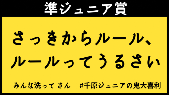 またこの次にジュニアさんの評価が高かった、みんな洗ってさんの回答「さっきからルール、ルールってうるさい」を準ジュニア賞として、動画内でも登場したのぼり旗(ジュニアさん直筆サイン入り)をプレゼントします。