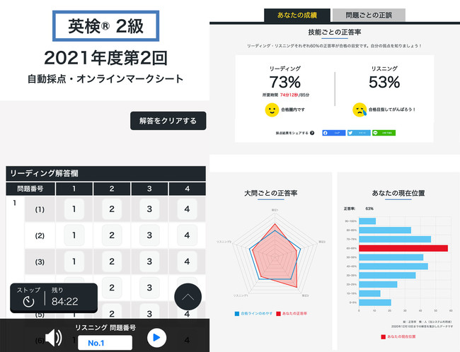 無料の「自動採点サービス」(PC/スマートフォン/タブレット対応)では、問題ごとの正誤だけでなく、技能ごと・大問ごとの正答率も自動で表示されます。