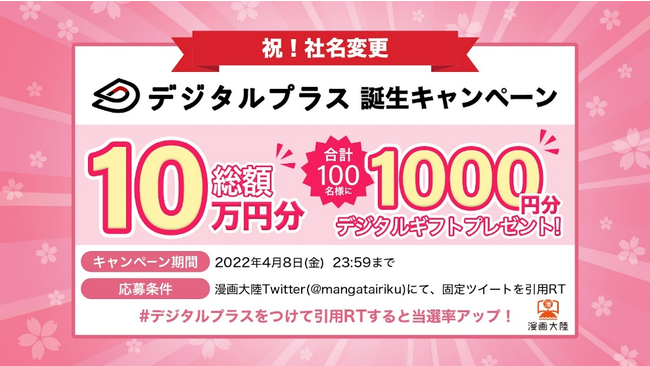 デジタルプラスへの社名変更を記念して、当社運営メディア「漫画大陸」にて、総額10万円分のデジタルギフトプレゼントキャンペーンを実施いたします。