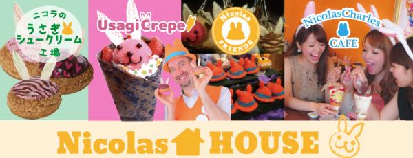 うさ耳をつけて楽しむカフェだが、本格フレンチ・本格スイーツ・アーティスティックな本格雑貨を楽しめる、として人気のニコラシャールカフェを中心に、うさぎクレープうさぎシュークリーム工場、うさぎグッズやかわいい雑貨がたくさんの雑貨屋さんの4ショップを楽しめる「ニコラハウス」(パックアーツ株式会社 久々野智 小哲津(くくのち こてつ)プロデュース渋谷区神宮前4-26-5 1・2階)