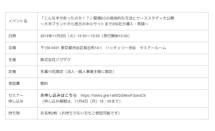 11/5(火)【越境ECセミナー開催<参加無料>】ロコンド、ピーチ・ジョン、WEGO、三陽商会、RAGTAG、銀座ワシントン靴店、銀座かねまつ などが利用する越境ECソリューション!