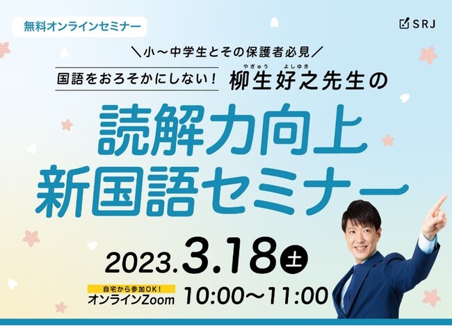 ICT学習教材の企画・開発を行なう株式会社SRJ(本社:東京都中央区、代表:堀川直人)は、2023年3月18日(土)、小学生から中学生とその保護者を対象に、自社主催の無料オンラインセミナー『国語をおろそかにしない!柳生好之先生の読解力向上新国語セミナー』を開催いたします。※学習塾・学校・スクール関係者の方もご参加可能です。