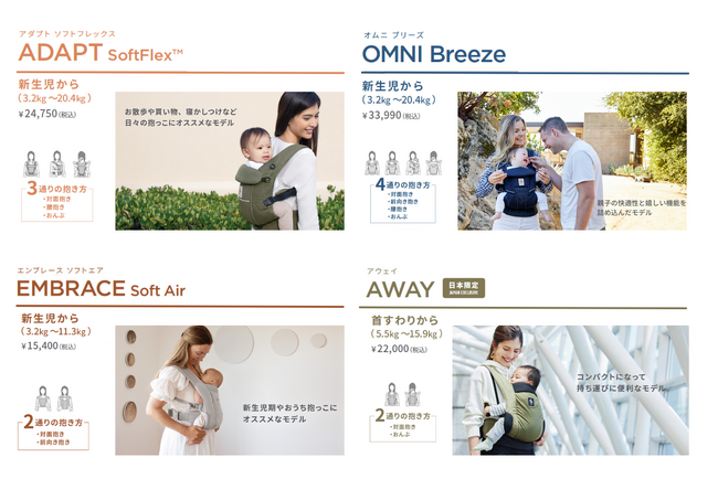 「OMNI Breeze(オムニ ブリーズ)」「ADAPT SoftFlex(アダプト ソフトフレックス)」「EMBRACE Soft Air(エンブレース ソフトエア)」「AWAY(アウェイ)」の4つのモデルが試着可能。お客さまのライフスタイルに合わせた抱っこひもをご紹介します。